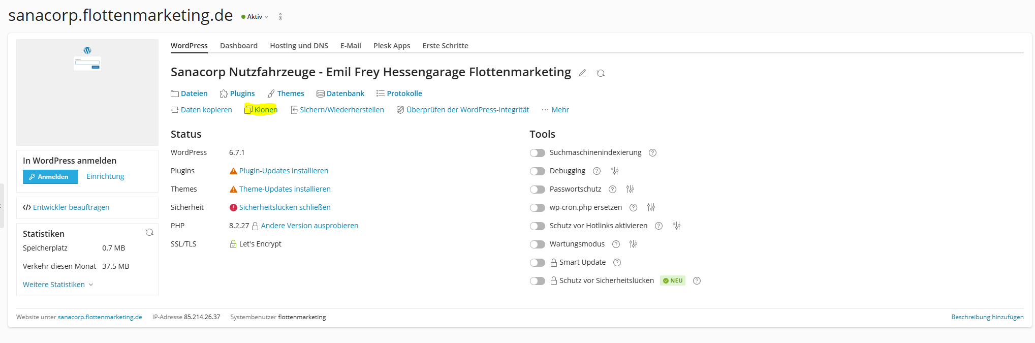 Unter „WordPress“ die Option „Klonen“ wählen: