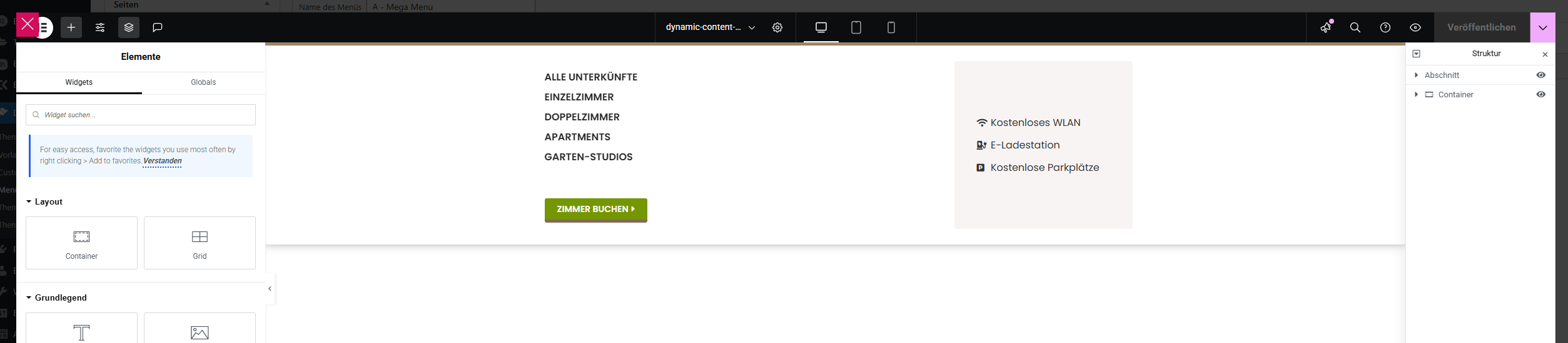 Diese Seite ist ganz normal mit Elementor aufgebaut. Die Zimmer / Apartments werden in einem Loop dargestellt und werden durch einen Taxonomy Filter gefiltert.