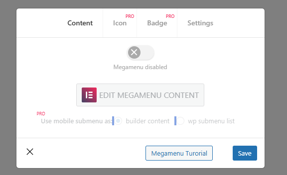Die Mega Menüs sind quasi Elementor Blöcke, diese kann man bearbeiten, wenn man auf die (durch das Hovern über ein Menüpunkt angezeigte) Taste „Mega Menü“ anklickt:
