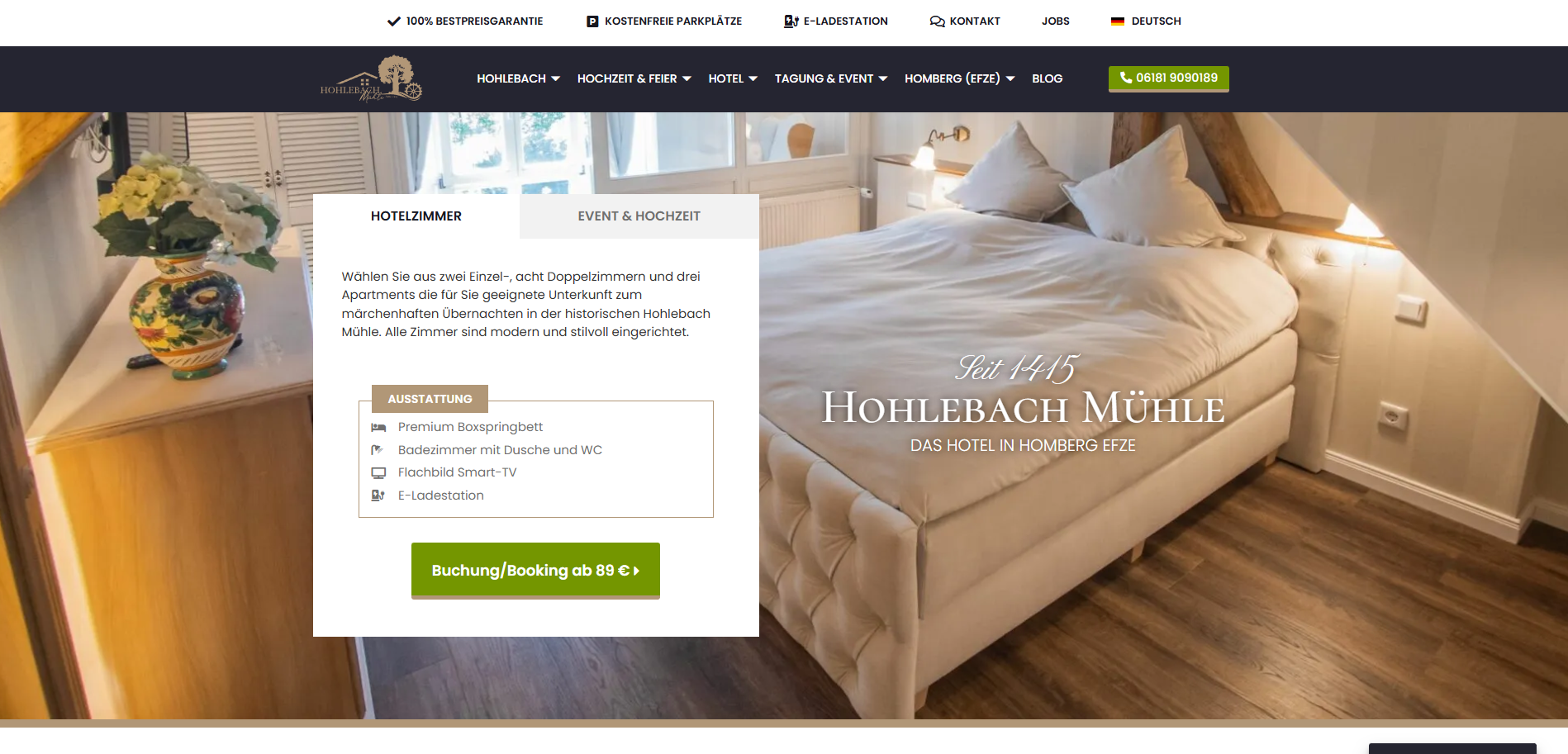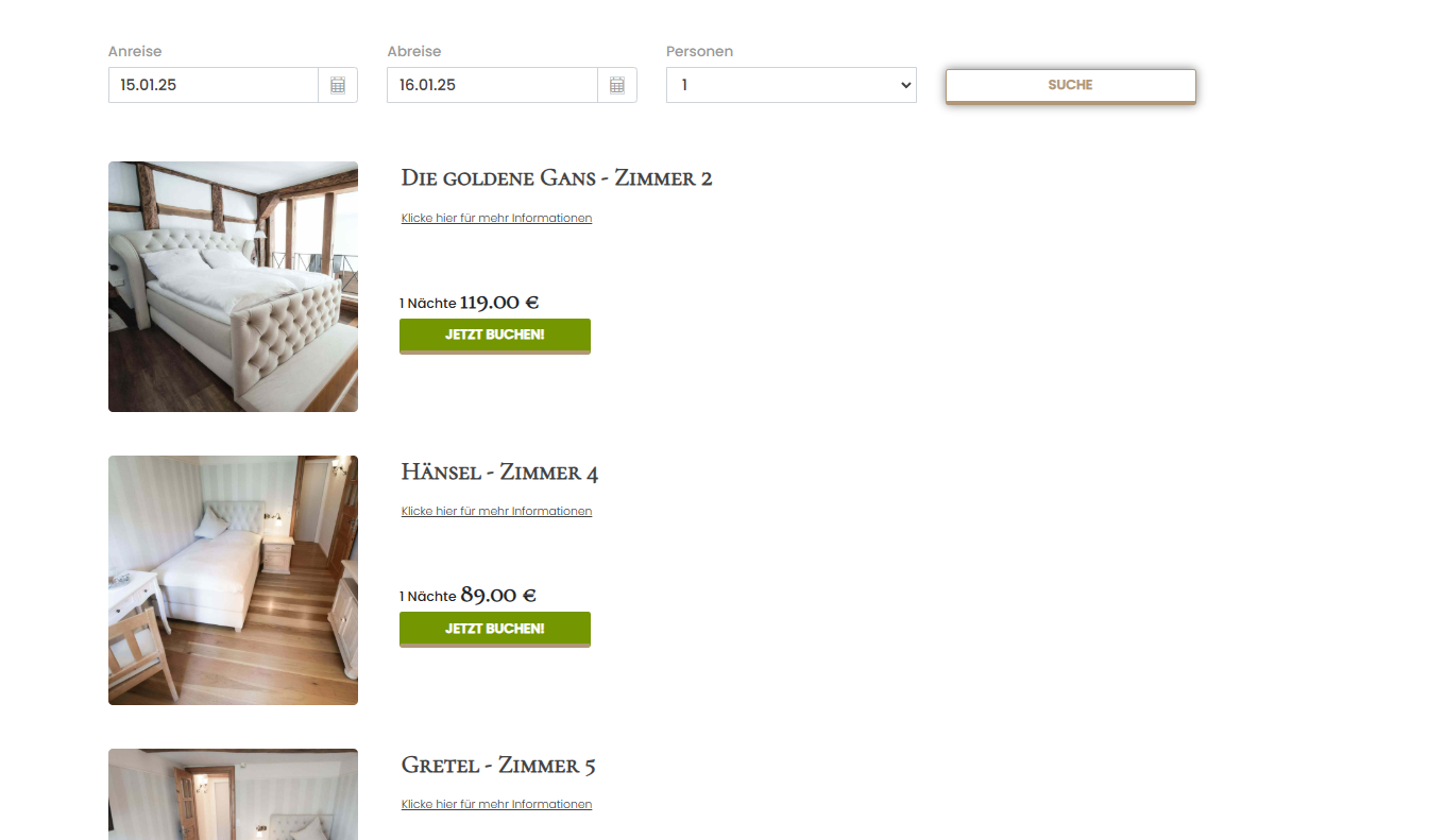 Für das Buchungssystem wurden eigene Seiten für jedes Zimmer angelegt, sodass potenzielle Gäste detaillierte Informationen und Bilder zu den einzelnen Unterkünften erhalten. Zusätzlich gibt es eine Übersichtsseite für alle Zimmer sowie eine zentrale Buchungsseite („Book Anything Available“), über die sich die gewünschten Daten schnell und unkompliziert prüfen lassen. Technisch basiert die Lösung auf Smoobu, dessen Buchungssystem über ein iFrame nahtlos in die Website eingebunden wurde. Dadurch werden Verfügbarkeitsprüfung, Buchung und Verwaltung der Reservierungen direkt auf hohlebach.de ermöglicht, ohne dass Nutzer*innen die Seite verlassen müssen.