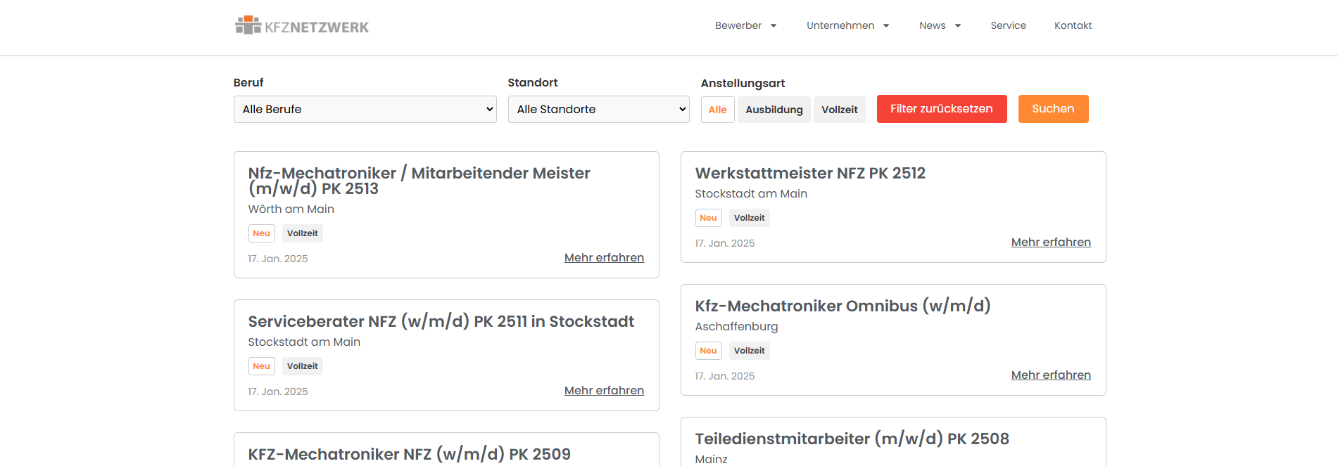 Für KFZ Netzwerk haben wir ein Job Board aufgebaut, das Ziel war, die Jobs aus Coveto automatisch in die Website zu importieren.