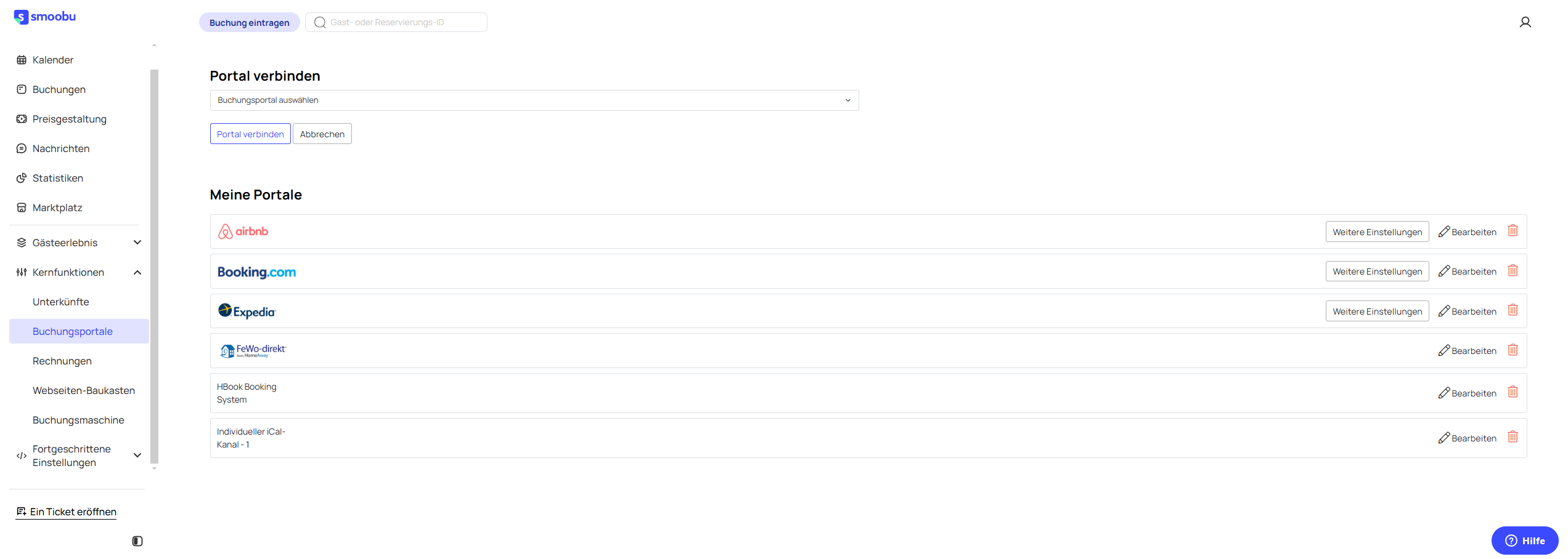Bei Smoobu einloggen > Kernfunktionen > Buchungsportale > Portal auswählen und auf „Portal verbinden“ klicken.