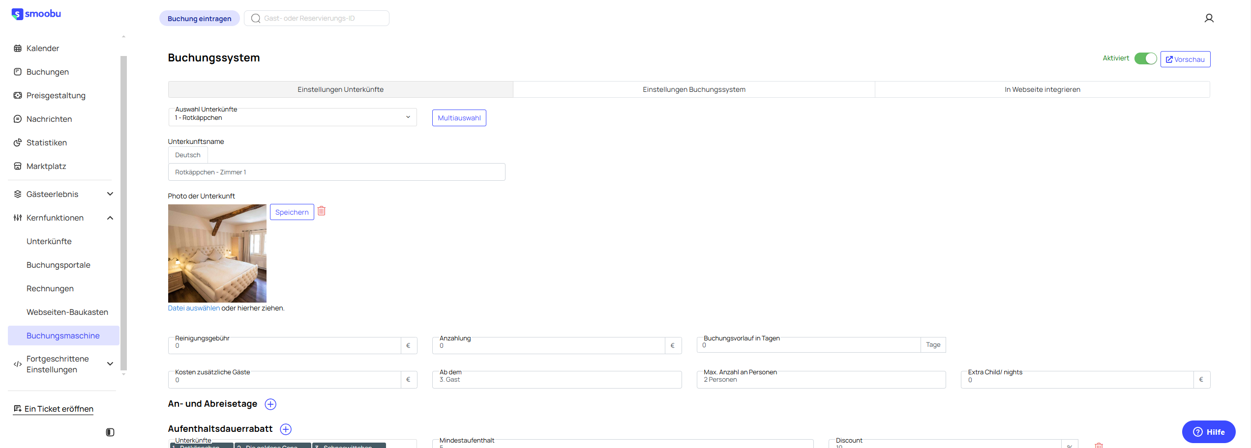 Alle Details können unter „Smoobu > Kernfunktionen > Buchungsmaschine“ angepasst werden.