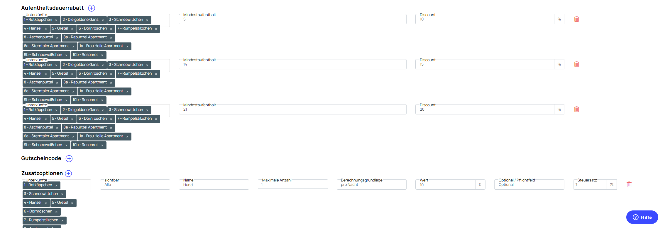 Hier werden auch die Frühstückspreise, Aufenthaltsdauerrabatte, und alle weiteren Zusatzoptionen bearbeitet: